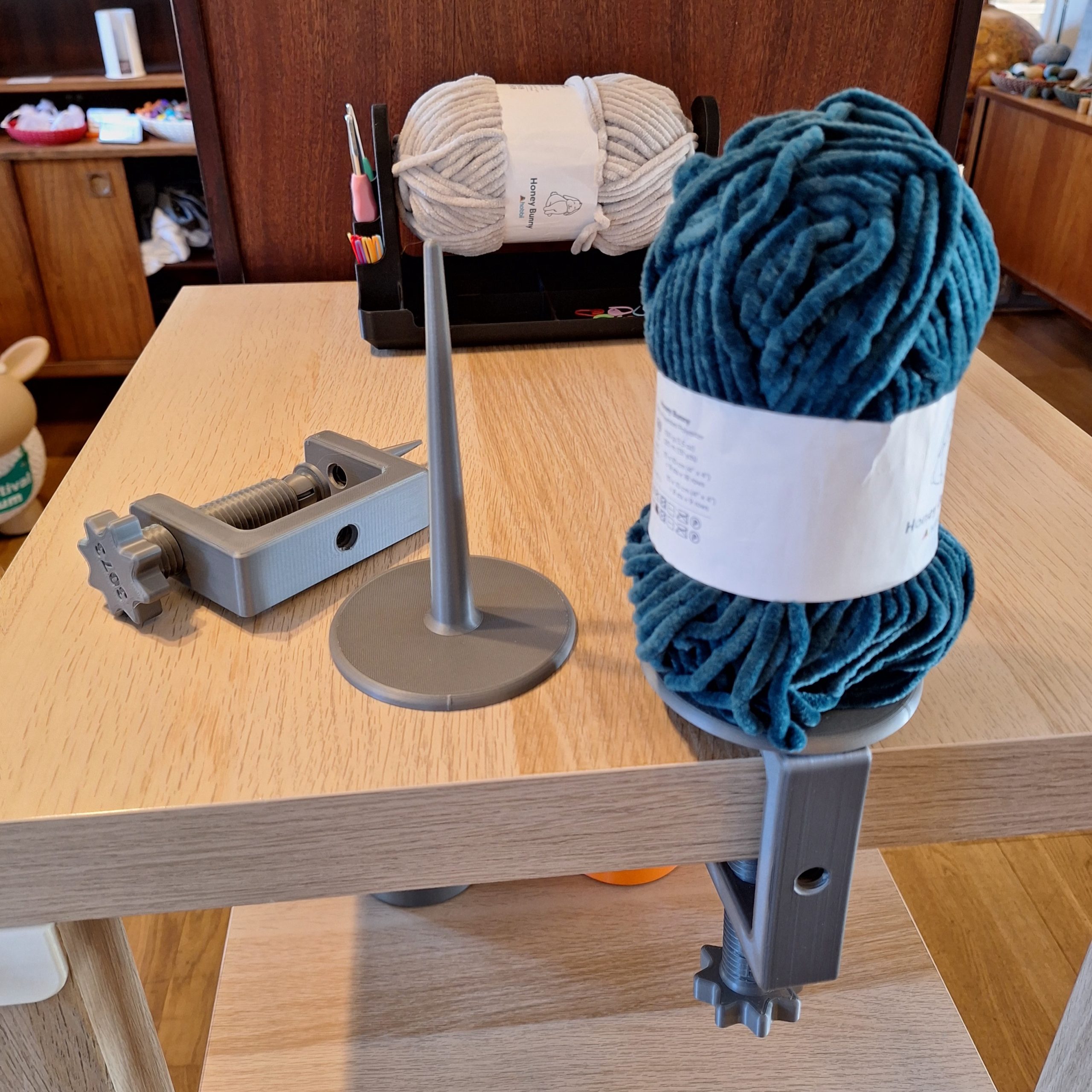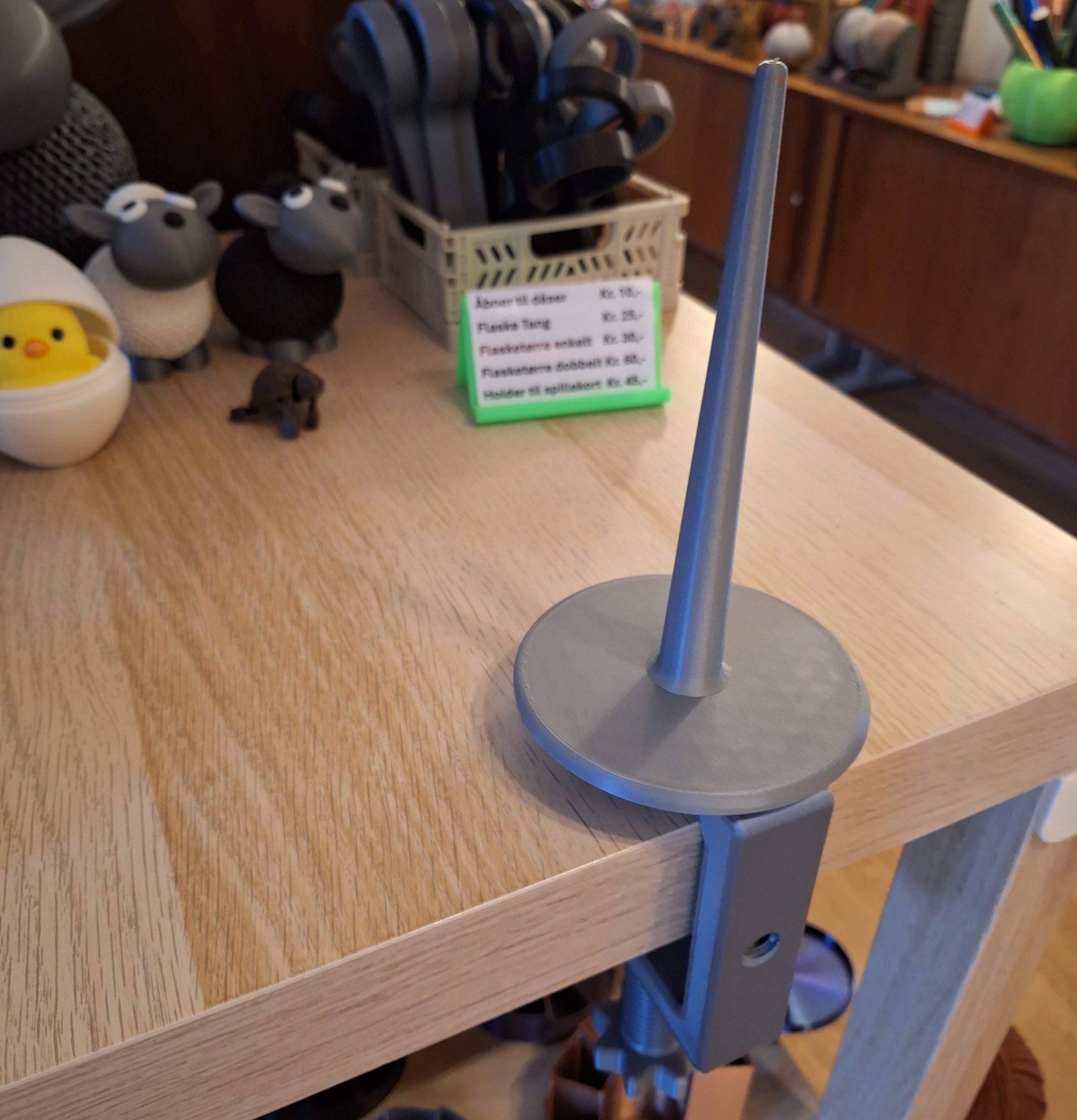 Karrusellen spændes fast på bordet, og toppen/spydet sættes på og den er færdig monteret, klar til at sætte dit garn på.