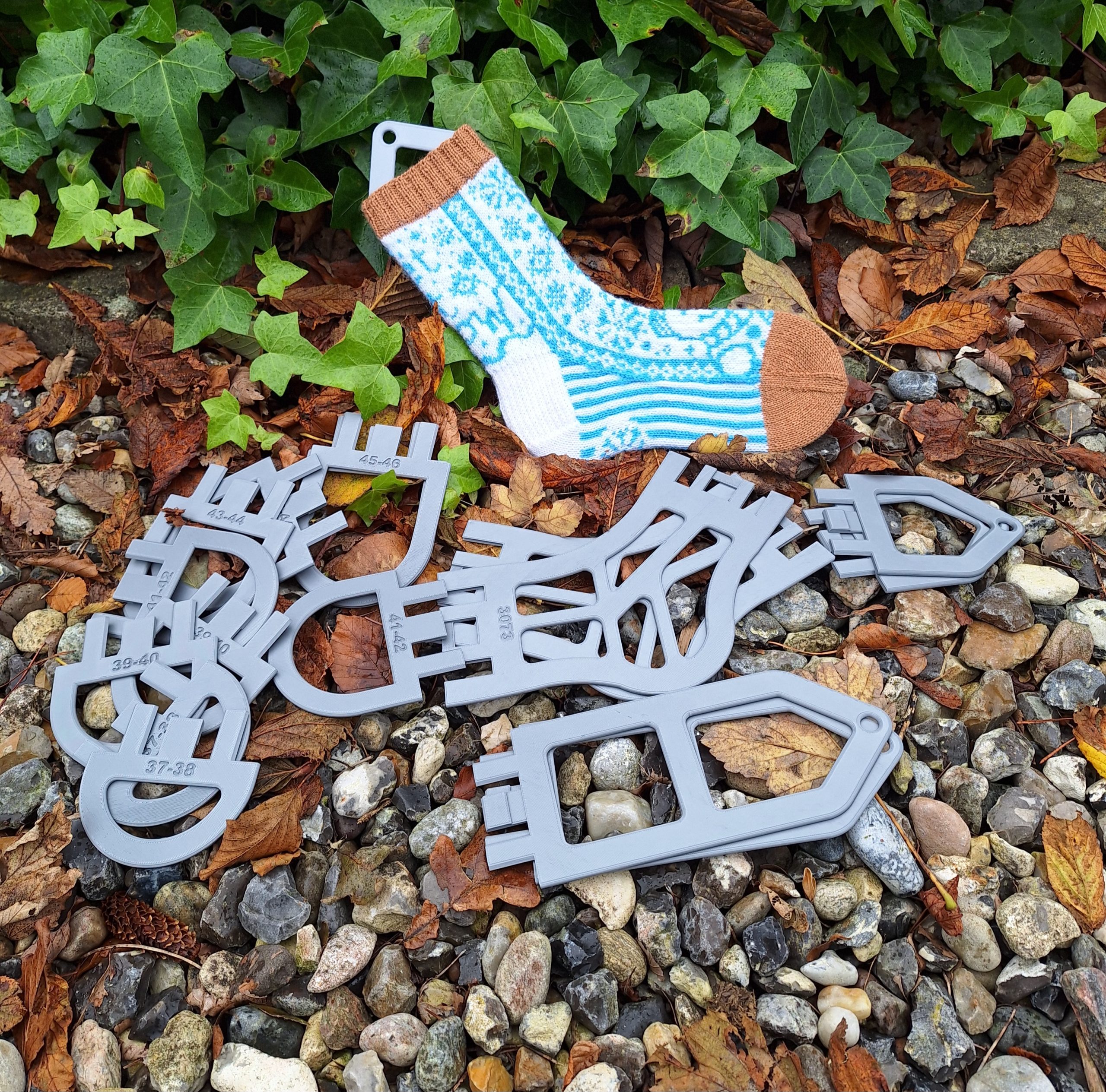 Sokkeblokkeren kan kombineres ud fra hvilken størrelser man strikker, og om det er et kort eller langt skaft man har brug for. Man klikker blot tå-spidsen på sokken og og så klikker man et skaft på.