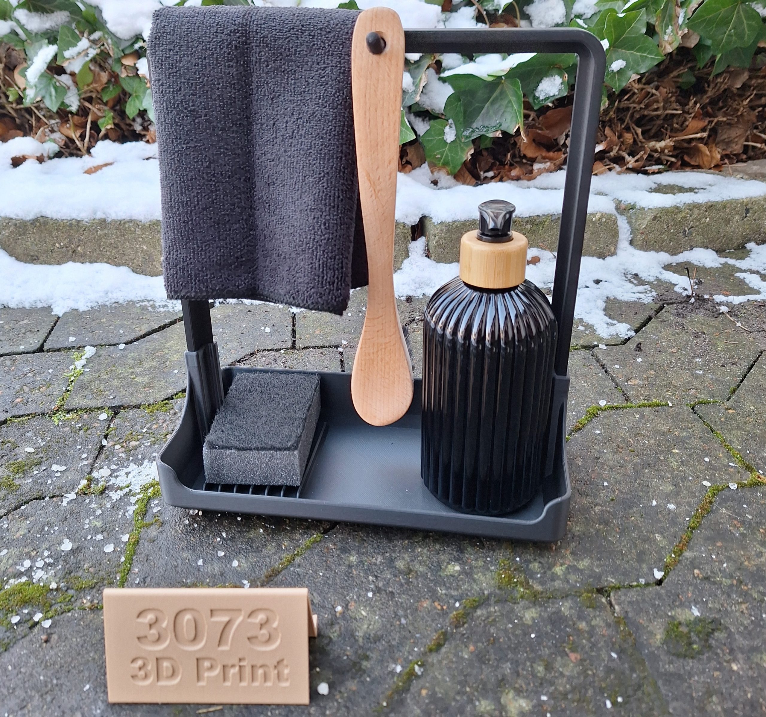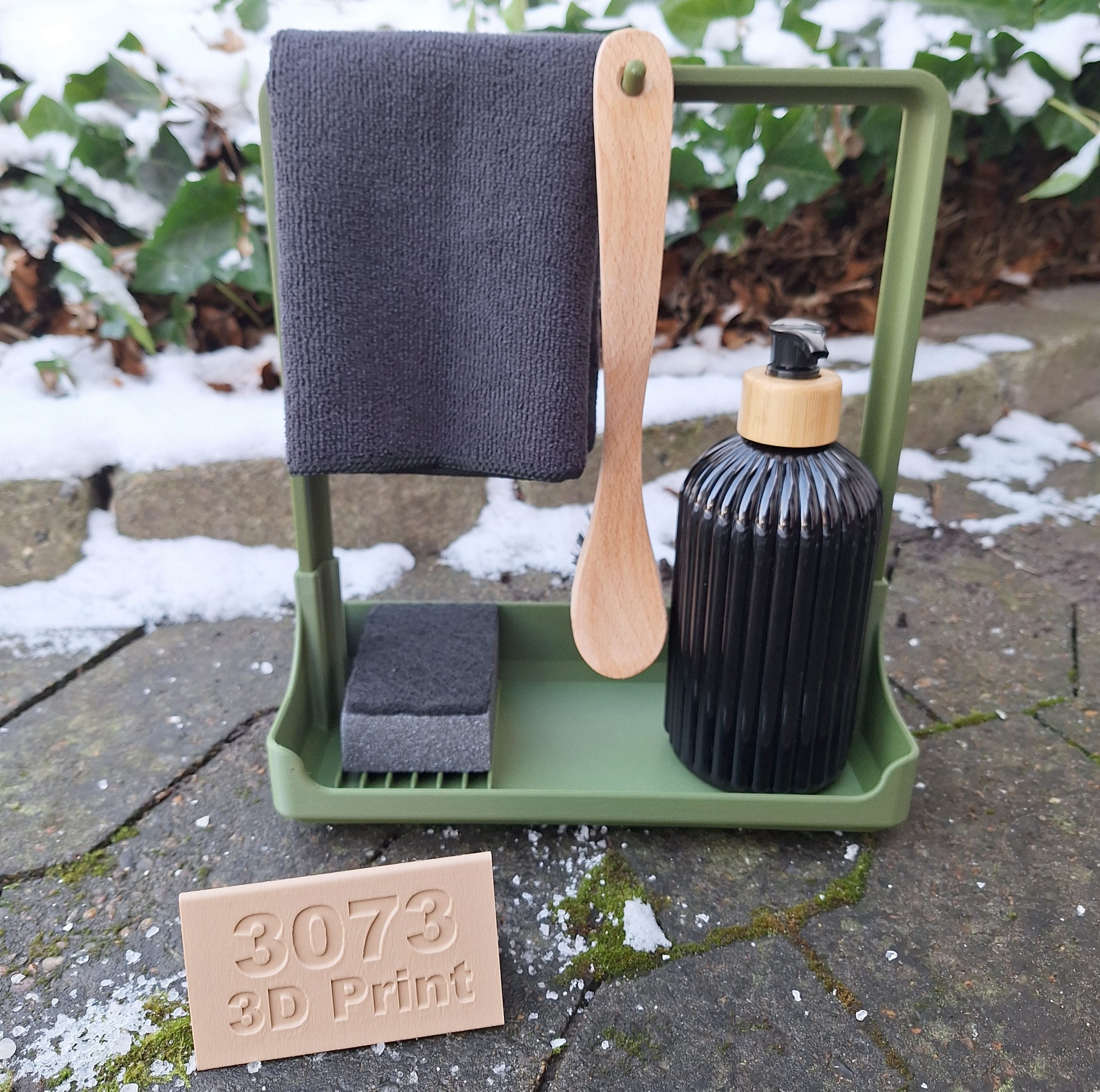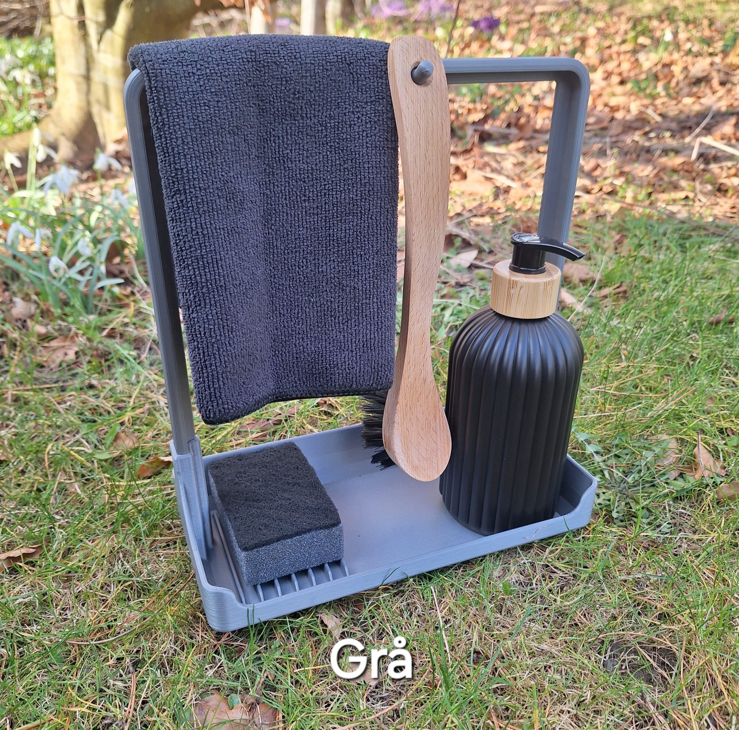 Den har plads til en opvaskebørste, en klud, en opvaskemiddel/pumpe og en svamp. Under svampen er der riller, så den kan få luft og tørre.