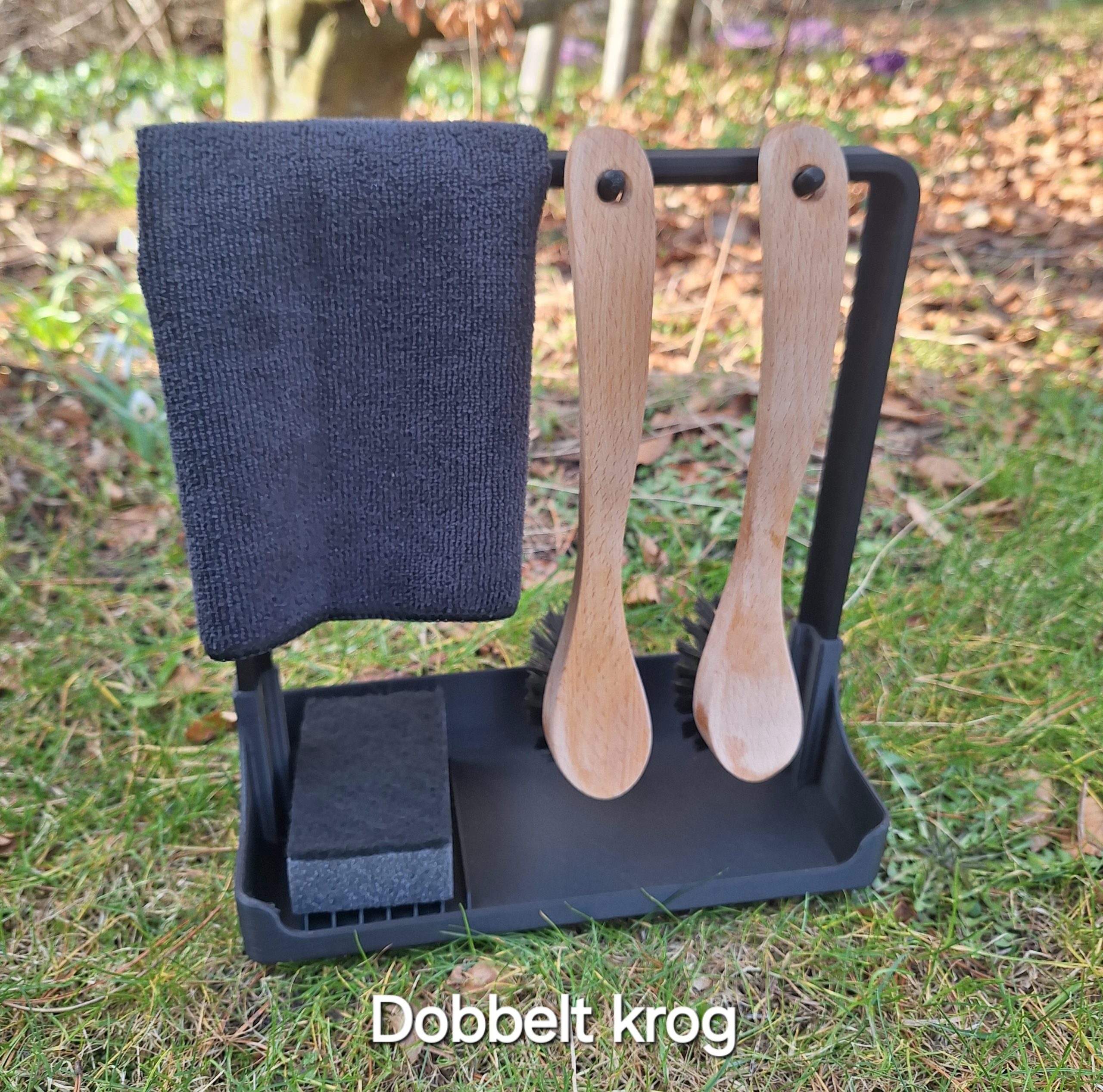 Bøjlen har plads til 1 opvaskebørste, men det er også muligt at få en med 2 kroge, så vil der dog ikke være plads til opvaskemiddel.